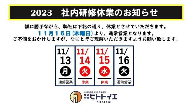 「社内研修休業のお知らせ」 ![]() 日頃より株式会社ヒトトイエをご愛顧頂き誠に有難うございます。 誠に勝手ながら 11月14日(火)11月15日(水)の2日間を休業日とさせて頂きます。 お客様・お取引先様には大変ご迷惑をお掛け致しますが、何卒、ご理解の程お願い申し上げます。 11月16日(木曜日)より元気に営業致します。宜しくお願い致します。 緊急の方はLINEでお問合せもしくは下記のメールにてご連絡ください。 連絡はLINEでも受け付けております!! ☆LINE登録方法 ①『LINEで返信』のアイコンをクリック ②『認証コード』をコピーして『友だち追加』をクリック ③メッセージで➁でコピーした『認証コード』を送信してください!! 何卒宜しくお願いいたします。 |