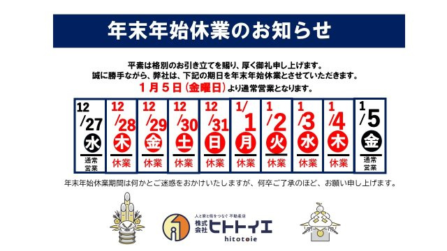 「年末年始休業のお知らせ」 ![]() 誠に勝手ながら、弊社は、下記の期日を年末年始休業とさせていただきます。 12月28日(木)~1月4日(木) 1月5日(金曜日)より、通常営業となります。 年末年始休業期間は何かとご迷惑をおかけいたしますが、何卒ご了承のほど、お願い申し上げます。 来年も変わらぬお引き立てのほどよろしくお願い申し上げます。 緊急の方はLINEでお問合せもしくは下記のメールにてご連絡ください。 連絡はLINEでも受け付けております!! ☆LINE登録方法 ①『LINEで返信』のアイコンをクリック ②『認証コード』をコピーして『友だち追加』をクリック ③メッセージで➁でコピーした『認証コード』を送信してください!! 何卒宜しくお願いいたします。 |